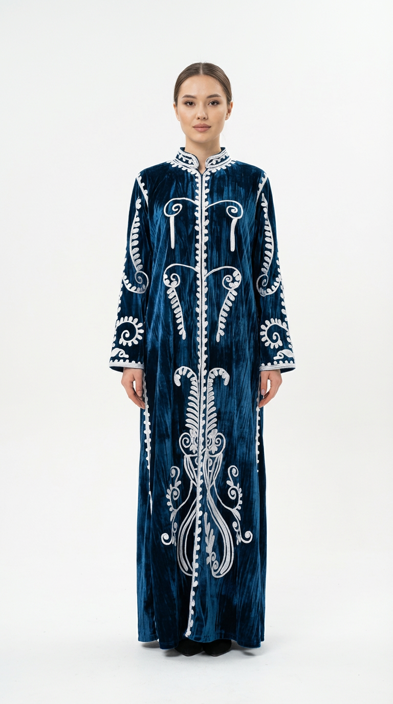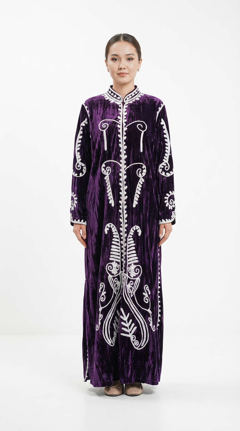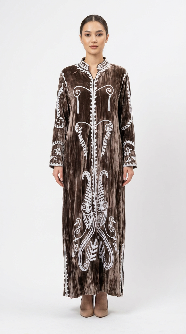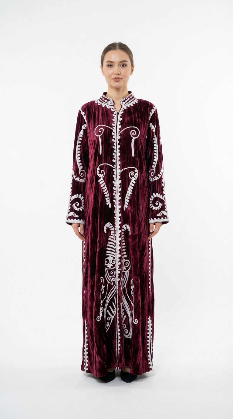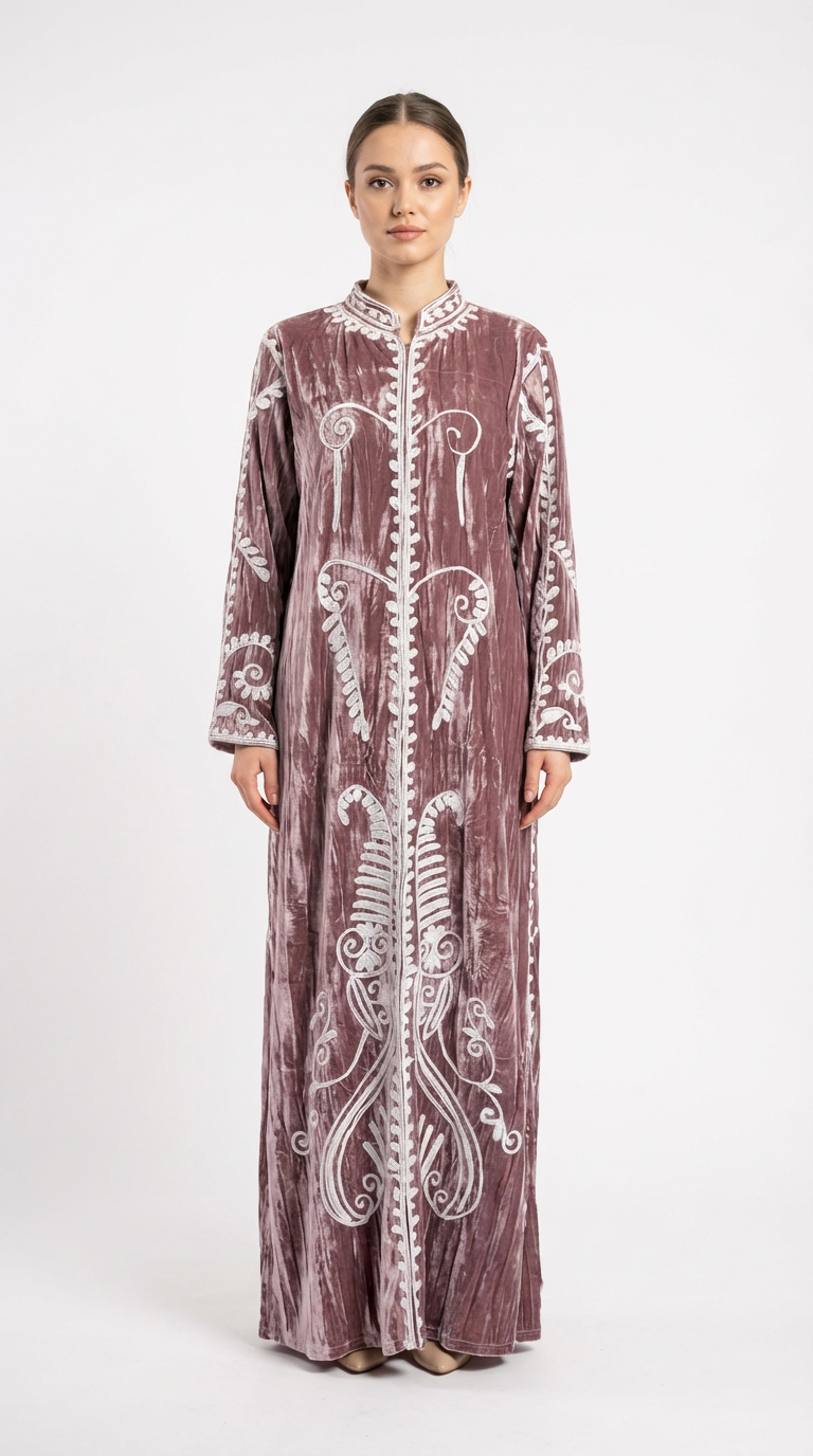 دراعة من المخمل المكسر الفاخر مزينة بتطريزات بيضاء أنيقة، مثالية للمناسبات الشتوية والجمعات العائلية.