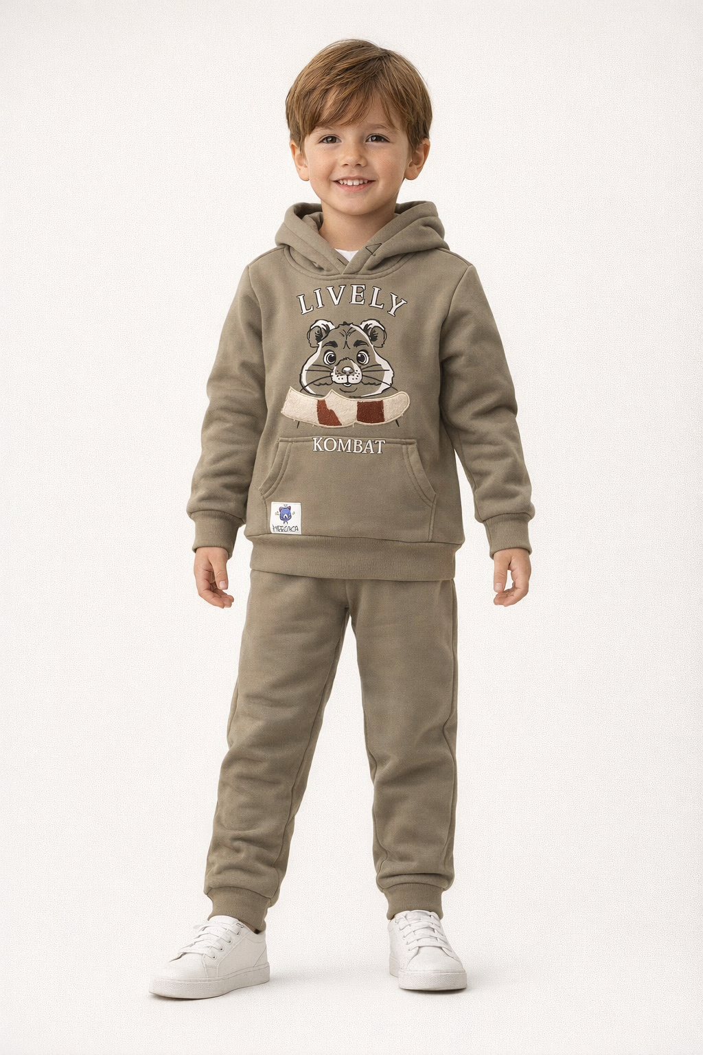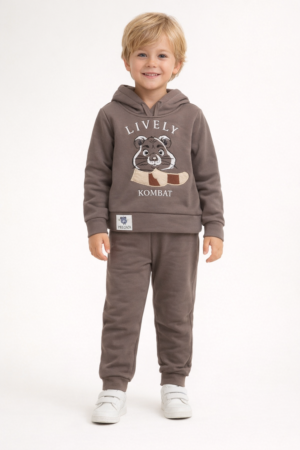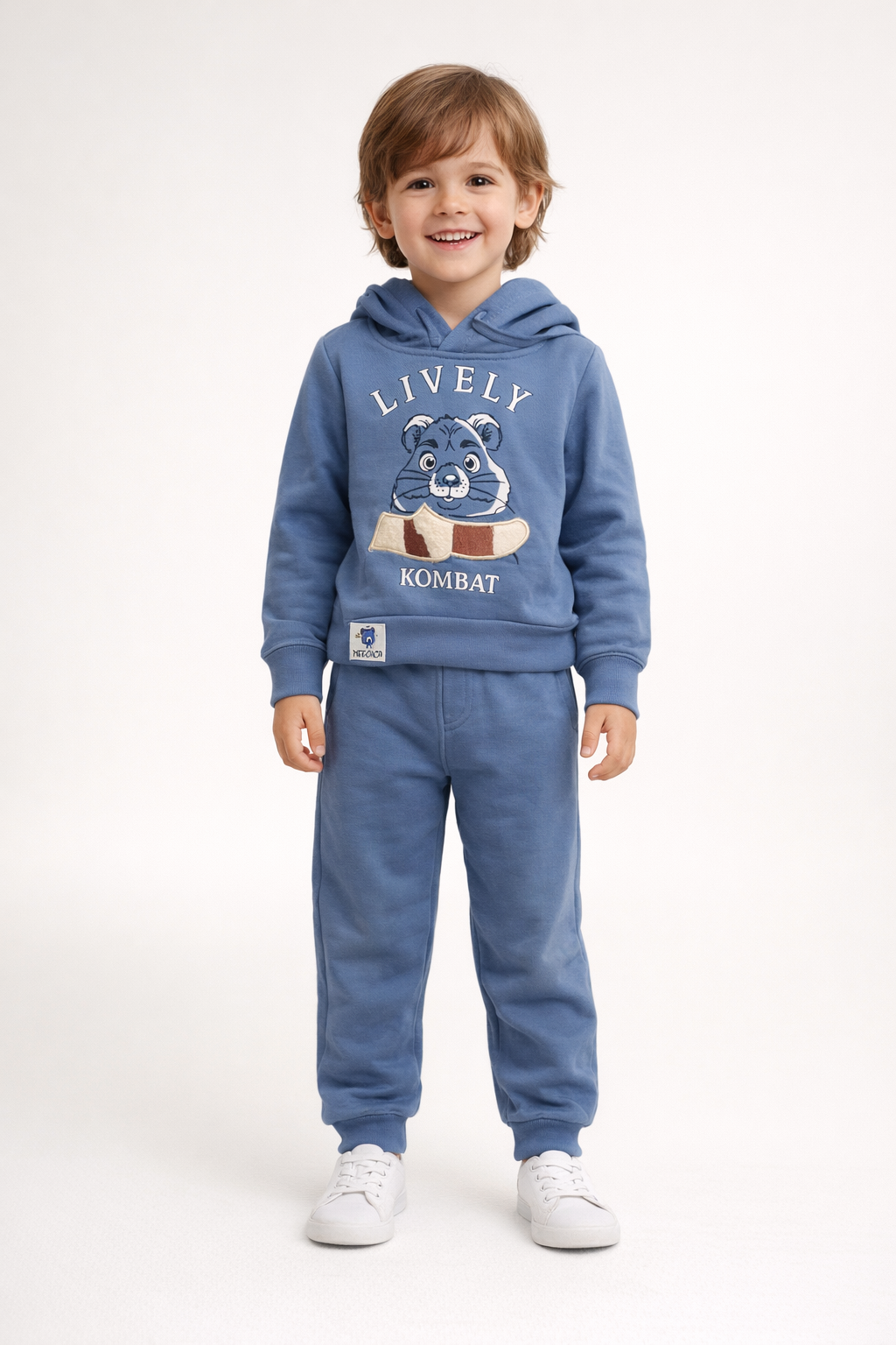 طقم أطفال مكون من قطعتين، سترة بغطاء للرأس وبنطلون رياضي، مزين برسومات كرتونية